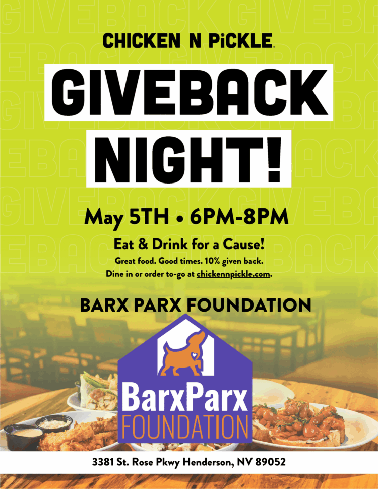 Chicken N Pickle 3381 St Rose Pkwy, Henderson, NV, United StatesChicken N Pickle Giveback Night Benefiting The Barx Parx Foundation Tuesday, May 5th | 6pm to 8pm 3381 St Rose Pkwy Henderson, NV 89052 10% of all food and drink purchases will be donated back to the Barx Parx Foundation! πΆβ€οΈπΎ