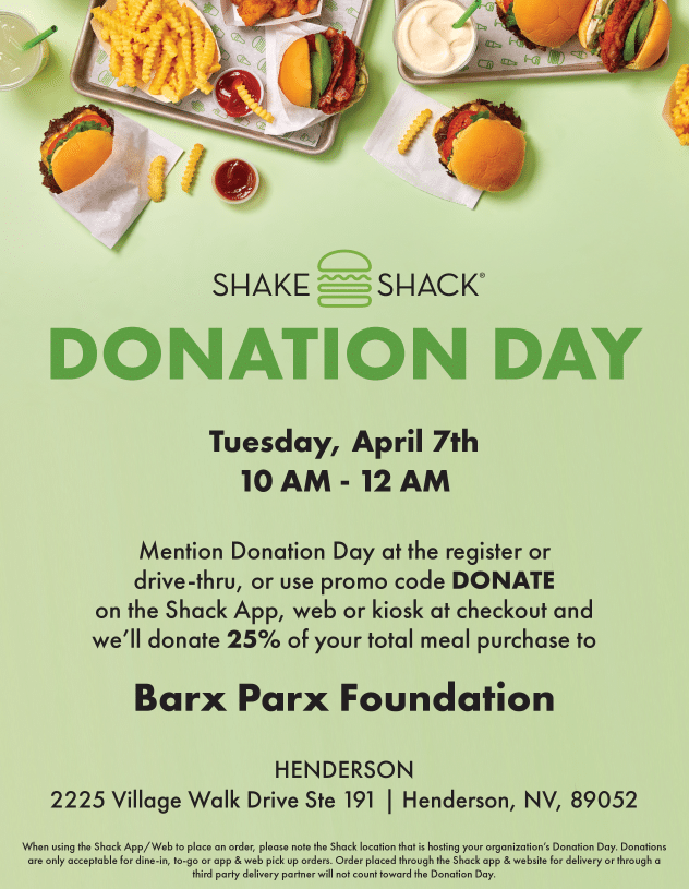 Eat To Support! SHAKE SHACK Tuesday, April 7th 10am to midnight 2225 Village Walk Drive #191 in Henderson (Located in The District) Donating back 25% to The Barx Parx Foundation for all IN STORE ORDERS <> (Open to the public! Share this event with all of your family and friends.)