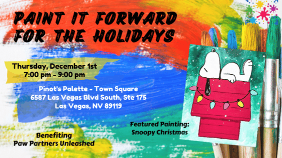 Pinot's Palette 6587 Las Vegas Blvd S, Suite 175, Las VegasCome paint the perfect holiday painting, Snoopy Christmas, by the worldwide legends, Snoopy and the Peanuts gang! We’ll have raffle prizes, too! Each participant will receive 2 free raffle tickets! $42 per guest Tickets can be purchased through Pinot’s Palette at: https://www.pinotspalette.com/townsquare/event/641893 Join us to help raise money to help animals in need while creating […]