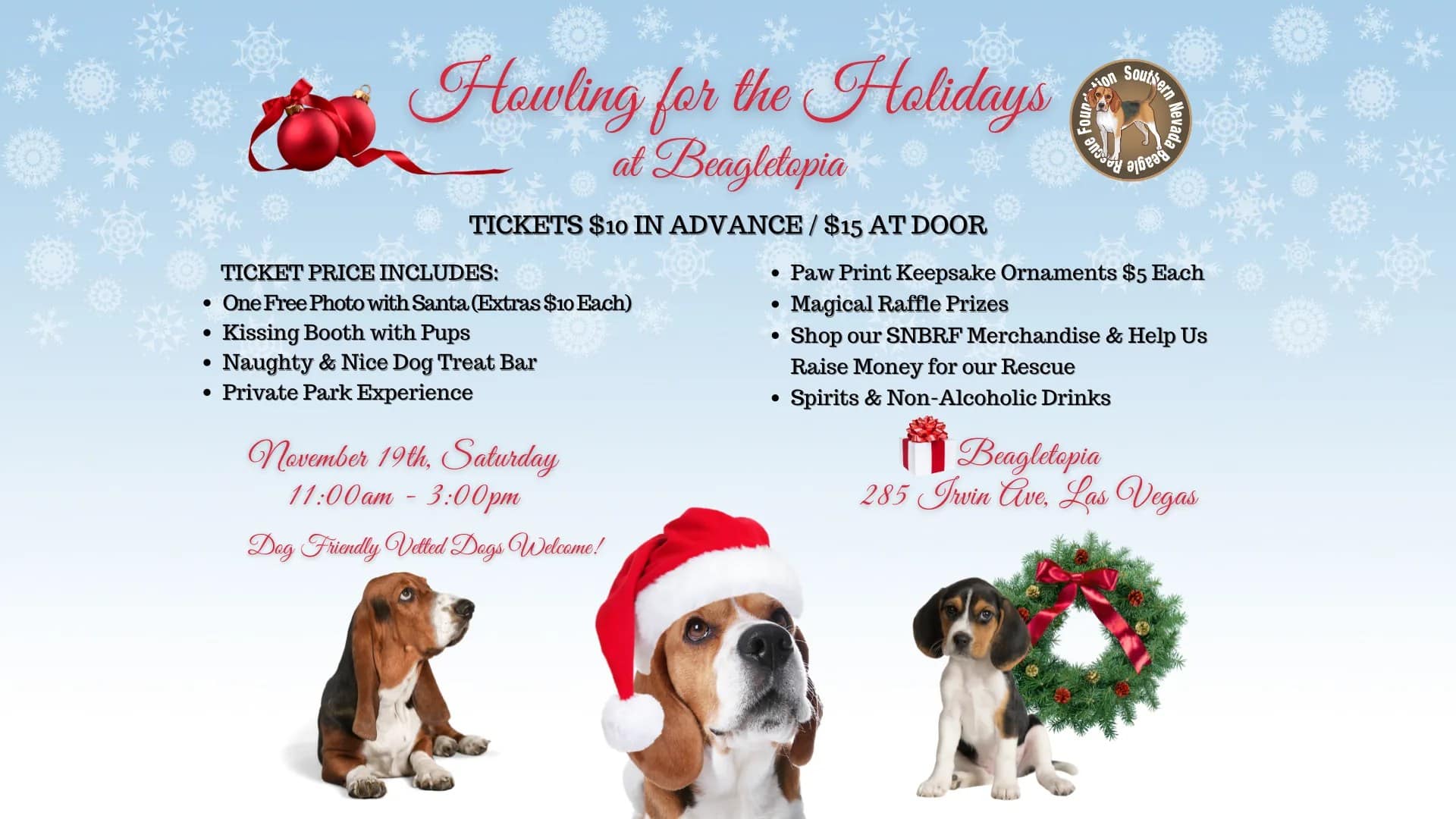 Beagletopia 285 Irvin Ave, Las Vegas, NV, United StatesTicket Price is: In Advance: $10 At the Door: $15 To purchase ticket please click here: https://www.paypal.com/cgi-bin/webscr?cmd=_s-xclick… Ticket Price Includes: Santa Photo One free photo with Santa • Additional Photos can be purchased at $10 each Paw Print Keepsake Ornaments • On sale day of for $5 each There will also be: • Kissing Booth […]