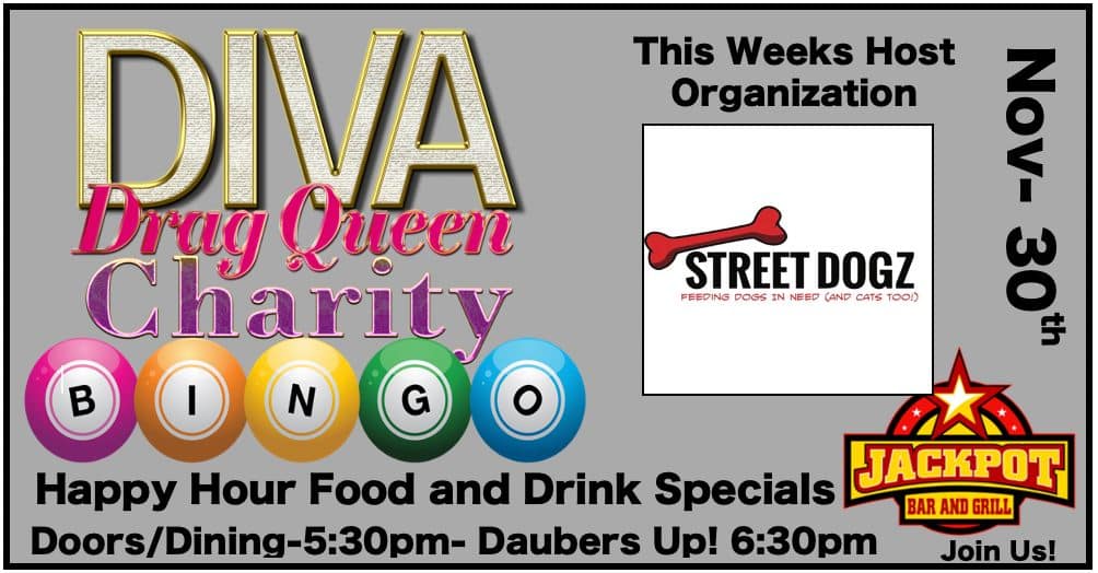 Jackpot Bar & Grill 4485 S. Jones Blvd., Las Vegas, NV, United StatesDiva Drag Queen Charity Bingo This week's host organization, Street Dogz LV! Happy Hour Food and Drink Specials Doors/Dining 5:30pm- Daubers Up! 6:30pm Jackpot Bar & Grill