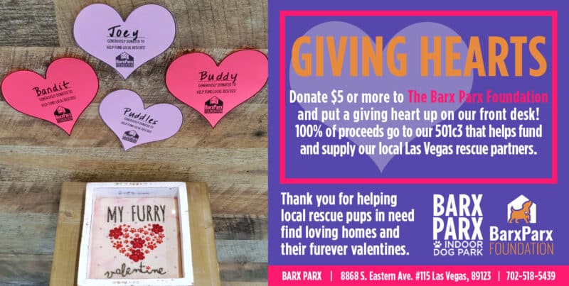 ππππΎ Donate $5 or more to the Barx Parx Foundation and fill out a giving heart to put up on our front desk!! πΆ Thank you for helping local rescue pups in need find loving homes and their furever valentines. 100% of the proceeds will benefit the Barx Parx Foundation, our 501c3 that helps fund, supply and support local Las Vegas rescues. Hearts can be bought in person or via text at 702-518-6439! Open fundraiser to the public! Anyone can purchase hearts!
