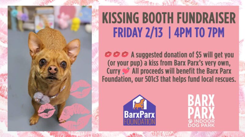 Join us Friday 2/13 for our 3rd Annual Kissing Booth Fundraiser! 4pm-7pm Friday 2/13 during Happy Hour! A suggested donation of $5 will get you (or your pup) a kiss from Barx Parx’s very own, Curry All proceeds will benefit the Barx Parx Foundation, our 501c3 that helps fund local rescues.